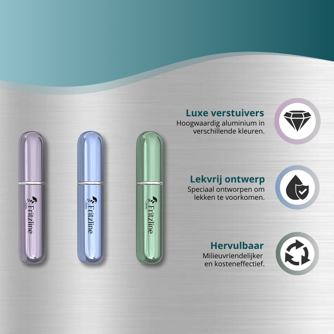 Met onze Fritzline parfumverstuivers kies je voor kwaliteit, stijl en gebruiksgemak. 100% lekvrij, gemaakt van duurzaam materiaal en beschikbaar in luxe kleuren – dat maakt ons uniek ten opzichte van andere merken.”