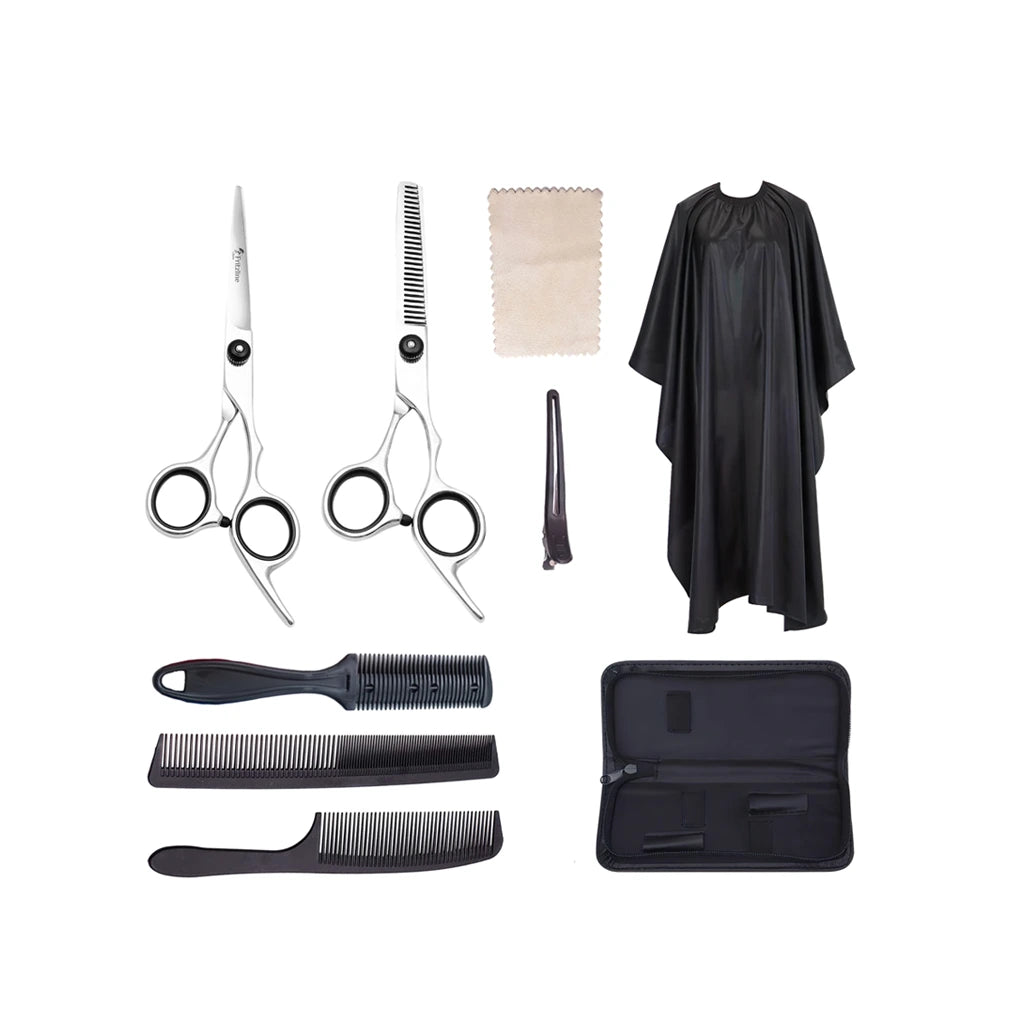 Setinhoud: 9-delig (kappersschaar, uitdunschaar, kappersmantel, haarclips, haarkammen, uitdunkam, poleerdoekje)
