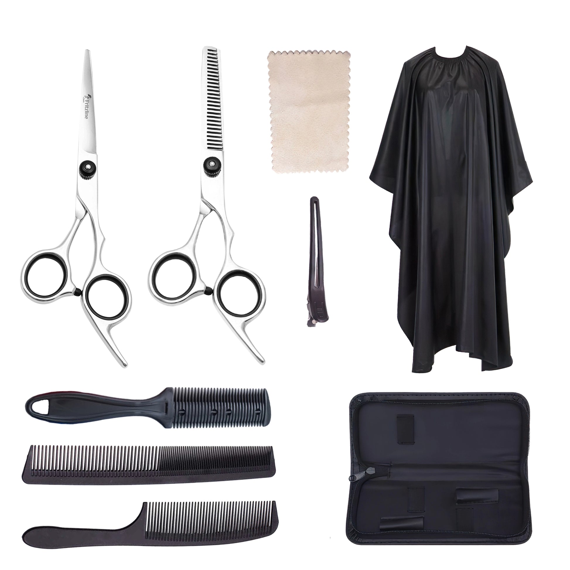 Setinhoud: 9-delig (kappersschaar, uitdunschaar, kappersmantel, haarclips, haarkammen, uitdunkam, poleerdoekje)