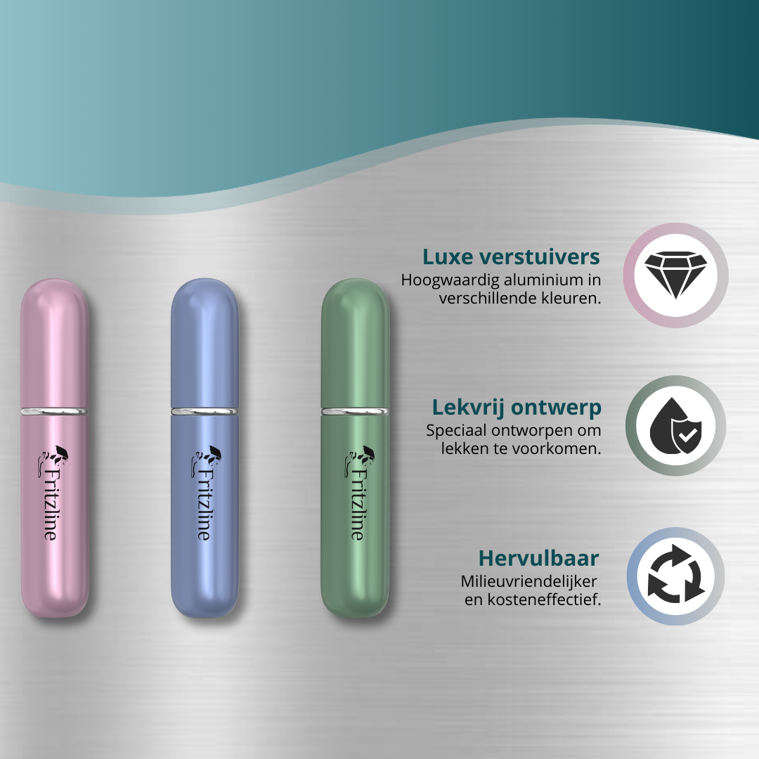 Met onze Fritzline parfumverstuivers kies je voor kwaliteit, stijl en gebruiksgemak. 100% lekvrij, gemaakt van duurzaam materiaal en beschikbaar in luxe kleuren – dat maakt ons uniek ten opzichte van andere merken.”